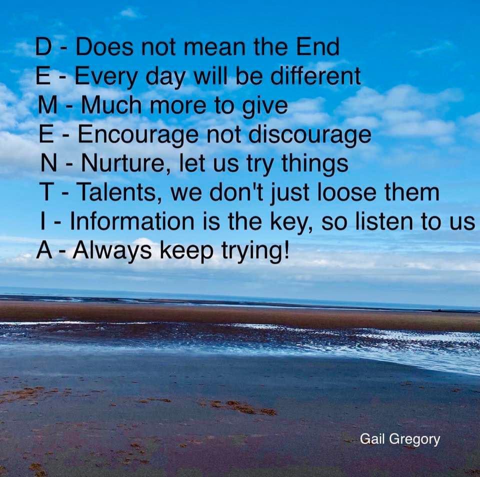 I felt this saying speaks not only if we are grieving the loss of a loved one but for many with dementia it’s what we often are faced with and feeling. We spend time searching for ourselves, for those pieces of ourselves that have slipped away. We never know when we open our eyes each day, how much of ourselves will remain, it can be overwhelming, daunting. sometimes we just don’t think about it, we just live in the moment, in the day. But sometimes we can’t escape it, the longing, the aching, for who and what we were, eventually many of us move into a place where we accept what is, look out the richness our illness has actually provided us, we find peace in what is, we don’t worry about what will be instead want to find ways to make the most of each precious day, to live in joy.